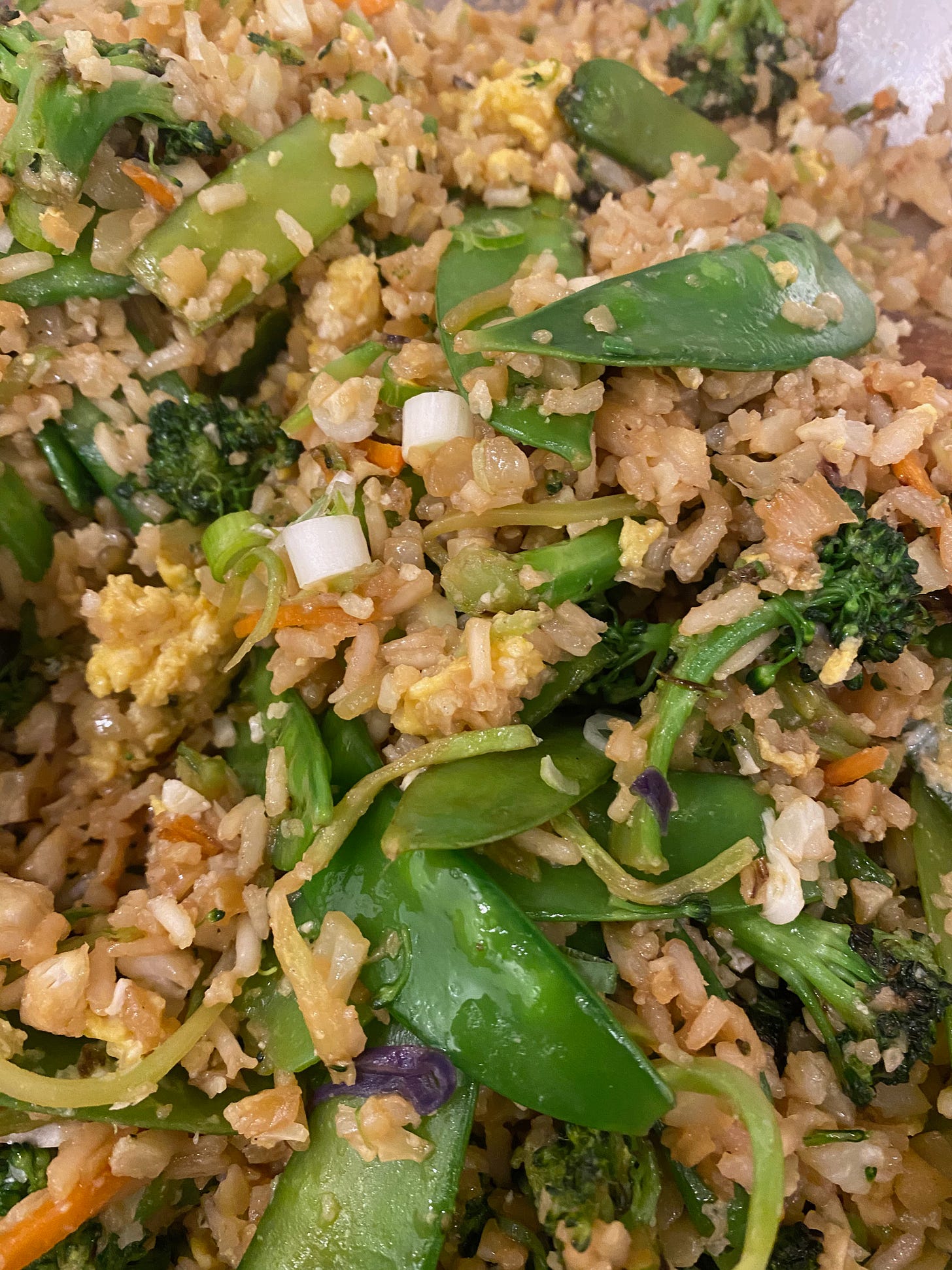 Pull out your biggest skillet. Drizzle and heat some neutral oil - I use grapeseed. Add onion, sauté until translucent, add garlic and ginger. Toss until fragrant. Add the veg, make sure the pieces are small so they cook quickly and on the same timescale. When they are still crunchy, add the chicken (if you are using it) and cook ‘till warm. Make a spot in the middle and add a little extra oil. Crack in the egg and soft scramble it. Toss it all together with soy sauce and sesame oil. More soy than sesame, but taste as you go. Sometimes I toss in some hoisin sauce, too. Fold in the thawed rice and riced cauliflower (kids have no idea when you add that). Top with chopped green onions and cilantro (if you like it, I do!). Serve with sriracha if you are into that.